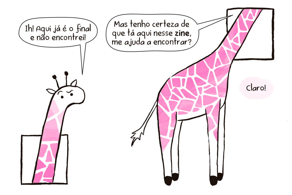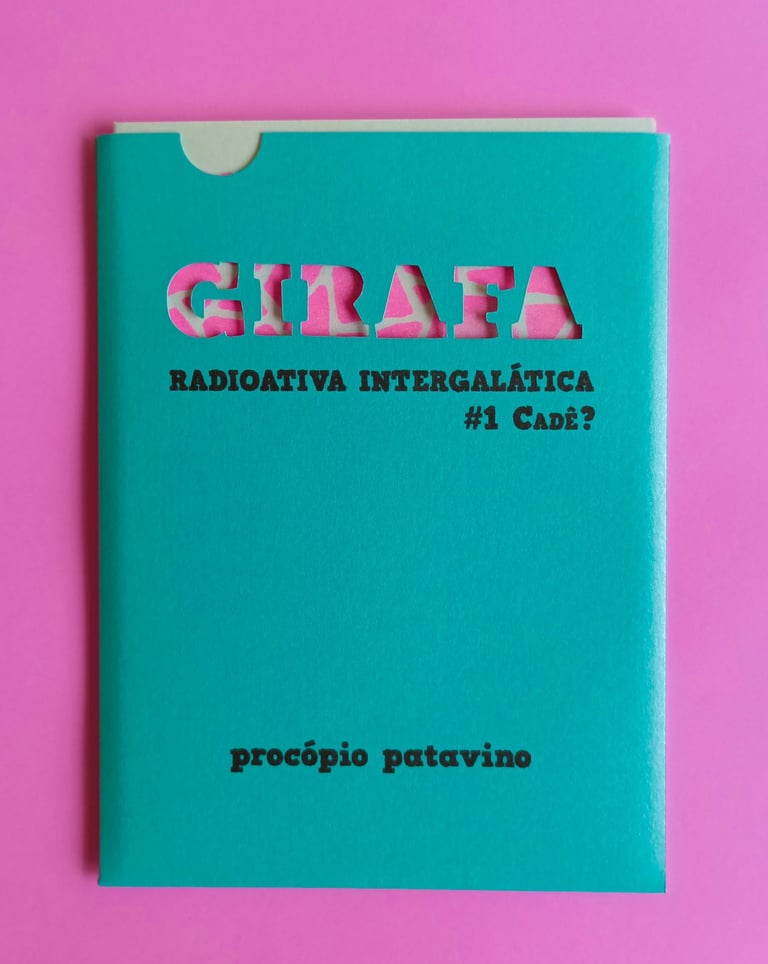 Voltada para o público infantil, a série “Girafa Radioativa Intergalática” busca explorar a materialidade de diversos formatos de publicação através de histórias cômicas e lúdicas. Tendo sempre como base uma única folha A3 impressa em risografia, cada volume apresenta uma possibilidade diferente de cortes e dobras, resultando sempre em um tamanho A6.